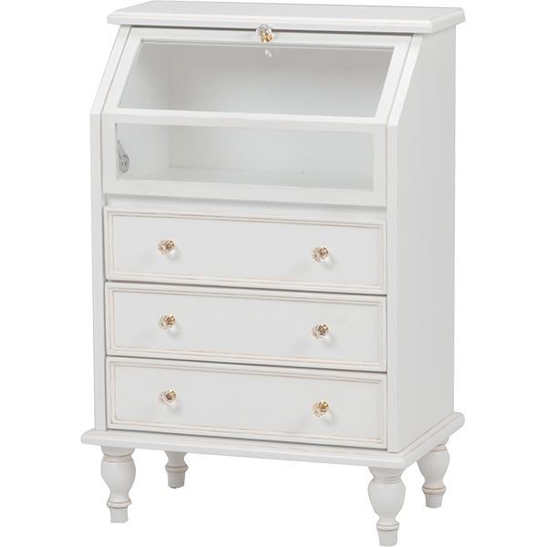 キラキラ取っ手で可愛さ倍増!引き出しの上はガラス張りのフラップ扉なので、お洒落に見せる収納ができるアンティーク風キャビネット