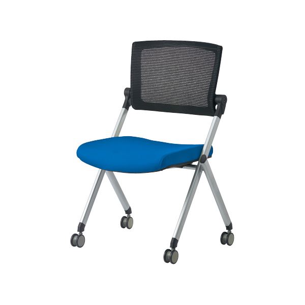 スタッキングが可能な「GK-90シリーズ」ミーティングチェア(背メッシュ)肘なし/ブルー。平行スタッキング可能。背はメッシュ素材で、背中の角度がフィットする背チルト機能搭載。座は座り心地を追求した厚めのクッションです。肘付タイプ(851-463)は垂直スタッキングも可能です。