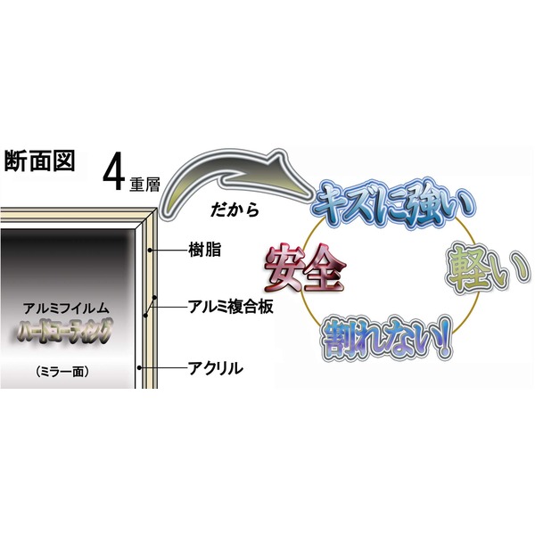従来の鏡とは違いガラスを使用しないで作られた安全なミラーです。