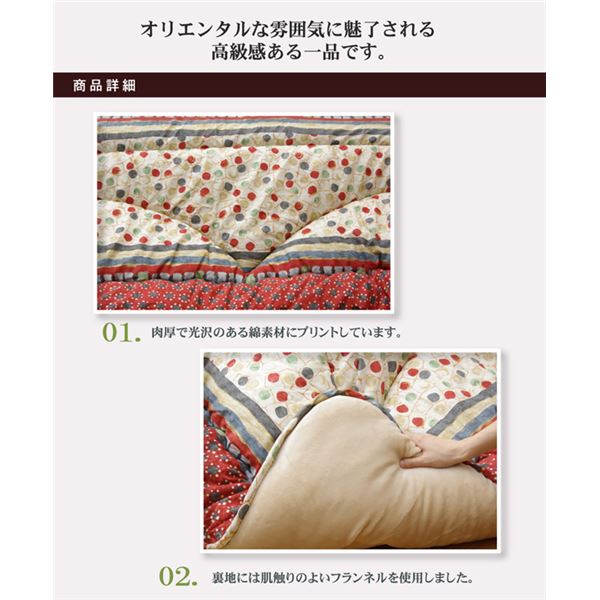 民族調のテイストに仕上げた綿素材こたつ布団です。デザインは国内でプリント工程を行う事で、より繊細・鮮明な柄を出す事が出来ました。日本製のプリントらしい、上質な質感と文様をお楽しみ下さい。肌に触れる裏地にはフランネルと呼ばれる、しっとり柔らかな生地を使用していす。又、布団が体にフィットする様にキルティングをしており(フィットキルト加工)、熱が逃げにくい形に仕上げました。部分暖房のコタツは電気代もおトクです。