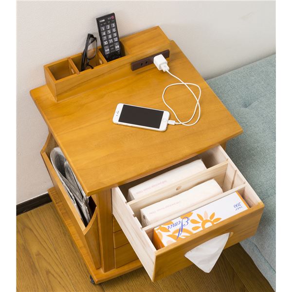 すっ桐 ナイトワゴン/サイドテーブル 奥行38cm 木製 二口コンセント/キャスター付き 完成品