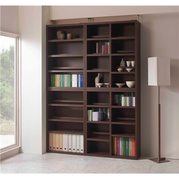 同じ幅のローチェストをラインナップし、「書棚+ローチェスト」の一体型収納を作り出すことができる。ロータイプの書棚は上下連結することができ、組み合わせ次第で天井まで届く壁面収納にもなる。