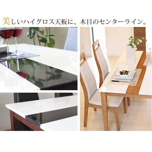 天板はハイグロス仕様で、中央に木目の帯がある、エレガントなイメージのダイニングです。