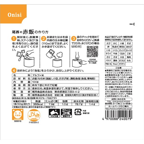 「尾西の赤飯」は水または湯を注いで混ぜるだけで出来上がるお手軽ごはんです。水で60分、お湯で20分で完成します。あずきもやわらかな、もちもち赤飯です。国産のもち米だけを使っています。