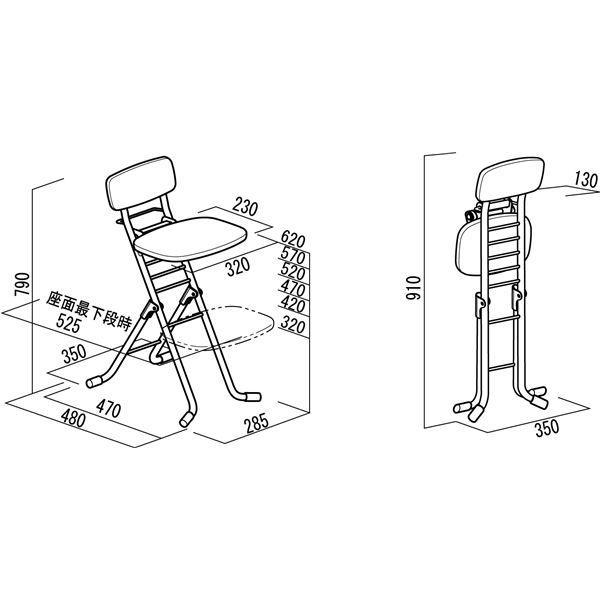 ワンタッチで座面の取り外しができ、320mmから620mmの間で6段階に座面高さ調節が可能です。