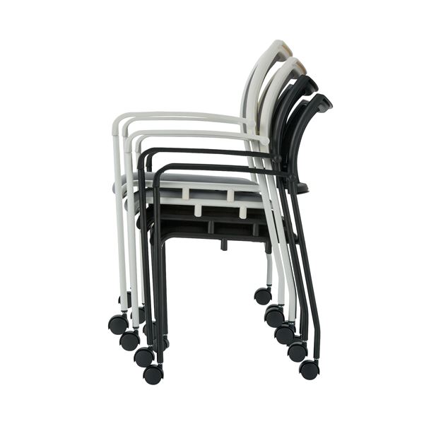 背メッシュ・モノトーンのミーティングチェア/キャスター脚タイプ/肘付ブラック。背メッシュ部分は通気性が良いので、ムレずにさわやかな座り心地です。ミーティングスペースをシックに演出します。4脚までスタッキングできて省スペース収納が可能。移動に便利なキャスター付きです。