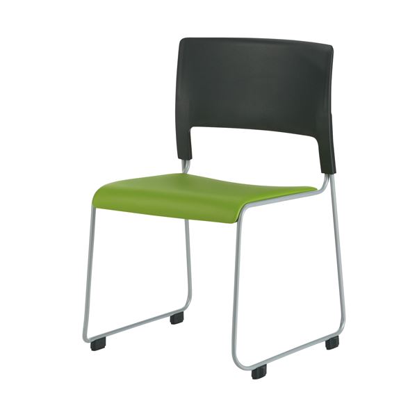 適度なたわみ感で快適な座り心地のスタッキングチェア「MO-17シリーズ」スタッキングチェア背ブラック×座グリーン/クッション付。フレームはシルバー。座にパンチングの樹脂を使用しているので、座ると自然にたわみ、快適な座り心地が得られます。汚れても簡単に拭き取れるウレタンレザーシートタイプ。4脚までスタッキングできます。省スペース収納したい場合、スタッキングチェア専用台車(707-044)を使えば20脚まで積載可能です。