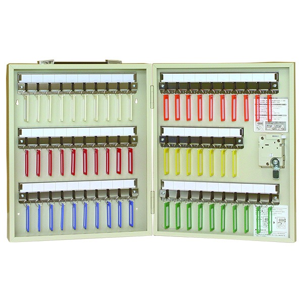 ダイヤル錠の為、合鍵を持ち歩く必要がありません。4桁の暗証番号は自由に設定できます。メカタイプのダイヤル錠の為、電池や電源の必要がありません。自由に持ち運べる様に、U型フックでキープレートが外れにくくなっています。キーハンガーに整理見出しが付いていて必要な鍵が一目でわかります。中扉は両面にキーハンガーが付いています。