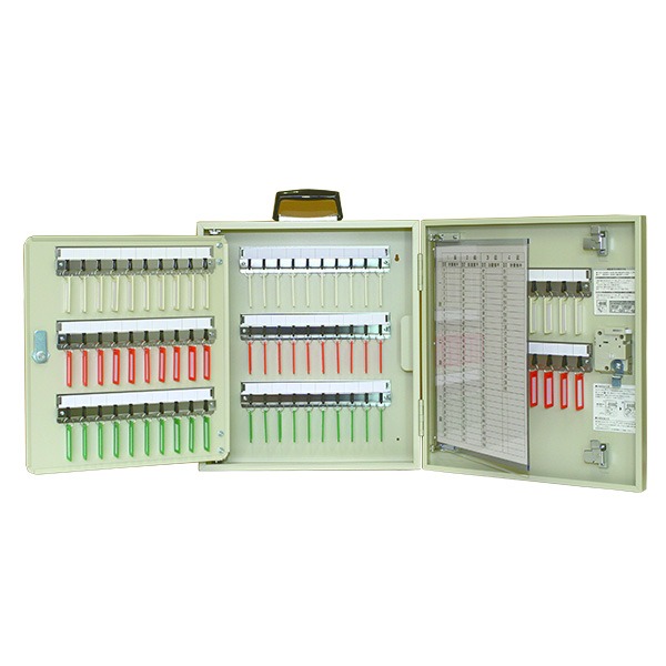 ダイヤル錠の為、合鍵を持ち歩く必要がありません。4桁の暗証番号は自由に設定できます。メカタイプのダイヤル錠の為、電池や電源の必要がありません。自由に持ち運べる様に、U型フックでキープレートが外れにくくなっています。キーハンガーに整理見出しが付いていて必要な鍵が一目でわかります。中扉は両面にキーハンガーが付いています。大型一覧表が付いています。
