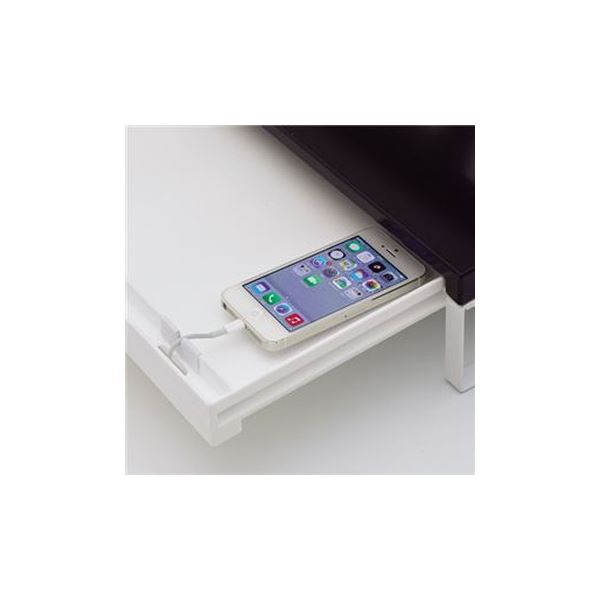 ●充電コード用の穴が開いている、スマホスタンド機能も付いた引き出し付・黒色の机上台です。小物収納としても便利。