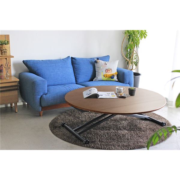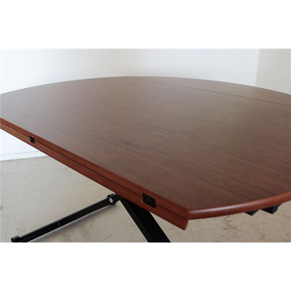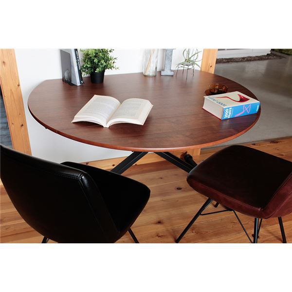 木目が美しいブラウンとブラック脚部の配色がおしゃれな印象のモダン&カジュアルな昇降テーブル。折りたたみ式の面長の天板は、サイドを開くことで簡単に2人用から5人用サイズへと調節が可能なため、活用の幅が広がります。