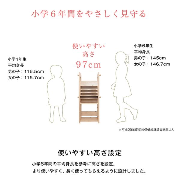 小学6年間の平均身長を参考に高さを設定。長く使っていただけるよう小学生のお子様の背丈に合わせて設計しました。