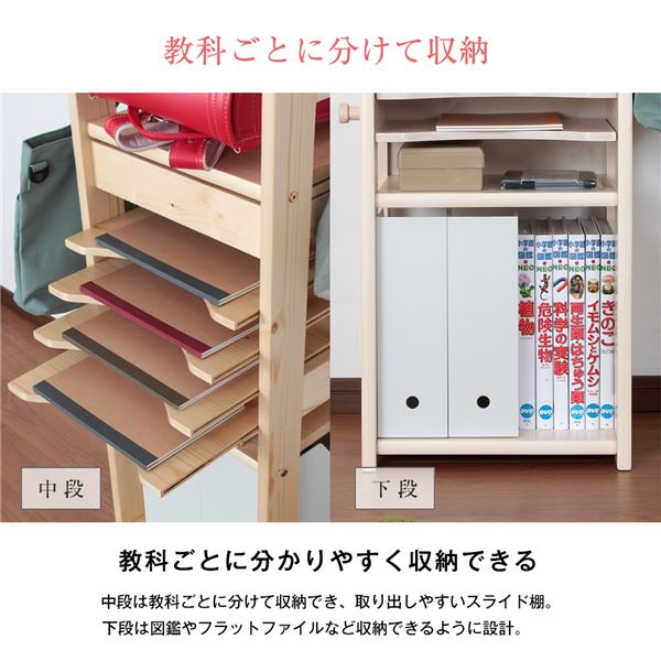 中段は教科ごとに仕分けて収納が出来るスライド棚。下段は図鑑やファイル等も収納出来る設計で、スッキリ収納できます。