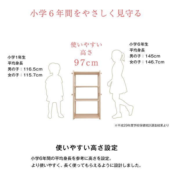 小学6年間の平均身長を参考に高さを設定。長く使っていただけるよう小学生のお子様の背丈に合わせて設計しました。