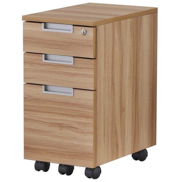 アソートシリーズのスチール脚デスク用に設計された奥行き490mmの3段スリムワゴン。幅1000mmのデスク下に置いてもちょうど良いサイズ感で足元が窮屈になりません。コンパクトながら収納力もあり、引出しの上段・中段にはA4クリアファイルが平置きに、下段にはA4ファイルの縦置きが可能です。引出しは下段のみフルオープン可、上・中段は1/3ほど残して引き出せなくなる仕様です。キャスターの内2個はストッパー付き。移動時以外はロックしてご使用ください。