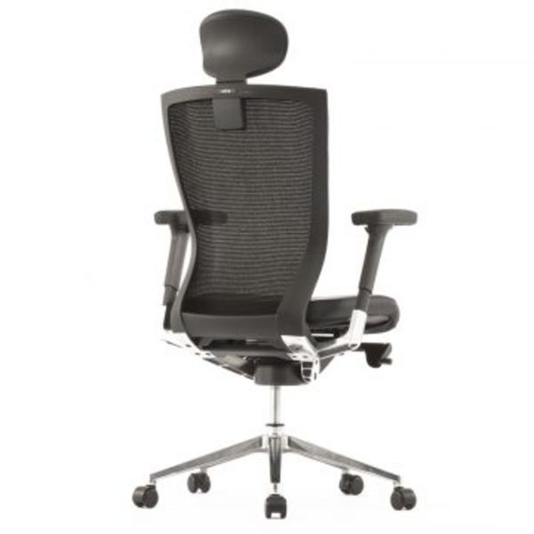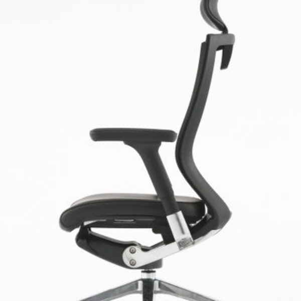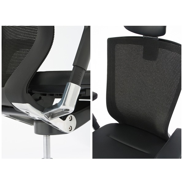 高級感のある本革と通気性のあるメッシュのコンビネーションチェアT50エグゼクティブ。作業姿勢に対応するシンクロロッキングや前傾チルト機構を搭載、体格やお好みに合わせて調整可能な各種機能を備えています。頭部を支える革貼りヘッドレスト付きでリラックス姿勢にも対応。アームは上下左右に調節可能で腕の負担を軽減します。座面にはイタリア製レザーを使用、硬い床でも滑りにくいウレタンキャスターを使用しています。