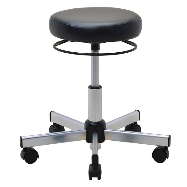どこに手を伸ばしても座面昇降ができる円形ハンドルのラウンドキャスタースツール。清潔感のあるクロムメッキ脚、張地は抗菌・防カビ仕様となっており、医療施設の診察椅子や、学習塾等教育施設での講師用スツールにも適しています。座面は395~525mmの範囲で昇降します。