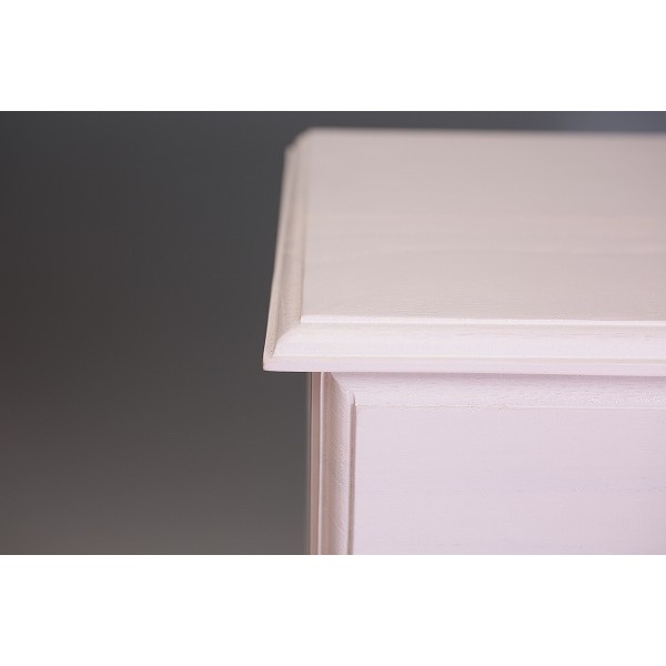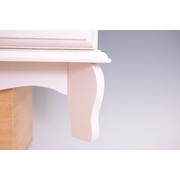 アンティーク調の取っ手。引き出しはアウトセットで引出しの前板が胴板より前に出て、胴板の木口がほぼ見えない仕様。リビングにはもちろん、ベッドサイドやファックス台にも便利。