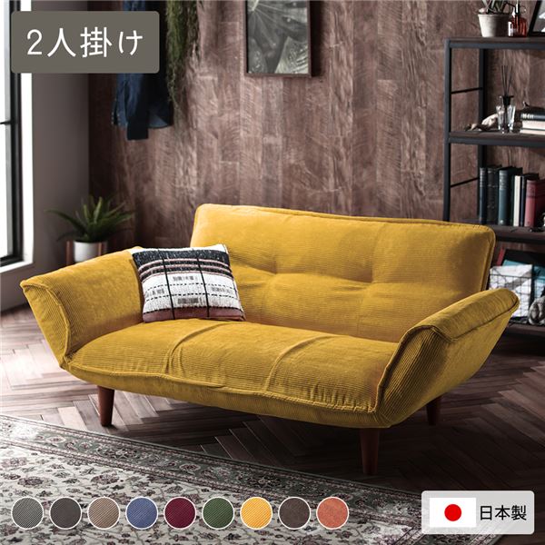 リクライニングソファ 2人掛 コーデュロイ生地 イエロー 脚部 日本製 ローソファ 代引不可