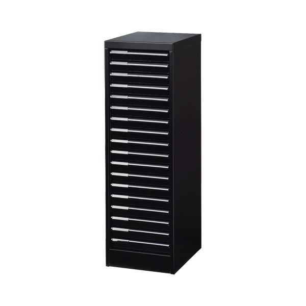 ●不透明カラー引き出しで中身が見えず、スッキリした印象に。浅型18段、色はマットブラックです。