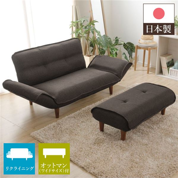 ワイドオットマン付き リクライニングソファー ダリアン生地 脚部ブラウン コンパクト 肘付き ローソファー 日本製 代引不可
