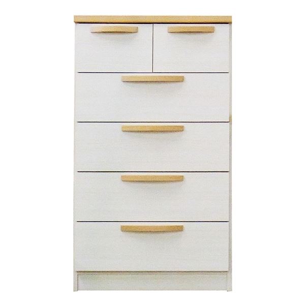 ホワイトカラーの本体に天板と取っ手がアクセントになったスリムチェスト。シンプルでやわらかい装いが落ちついた雰囲気の室内空間を演出します。