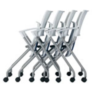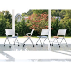 背樹脂のホワイトカラーがすっきりした印象のミーティングチェア。座はPVCレザー仕様のオレンジに背樹脂ホワイトのツートンカラー。背のカーブした形状が身体に程よくフィット。使わない時は座面を跳ね上げて平行スタッキング。簡単に省スペース収納できます。オプションで、メモ台と棚が付けられます。