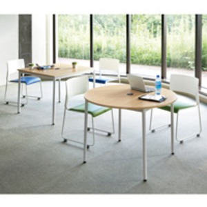 リフレッシュエリアやミーティングとしても使用可能なリフレッシュ&ミーティングテーブル(固定脚)/ナチュラル丸型天板・直径1000mm。脚部ホワイトで明るいスペースを演出します。天板中央には、配線用のコード穴がついています。