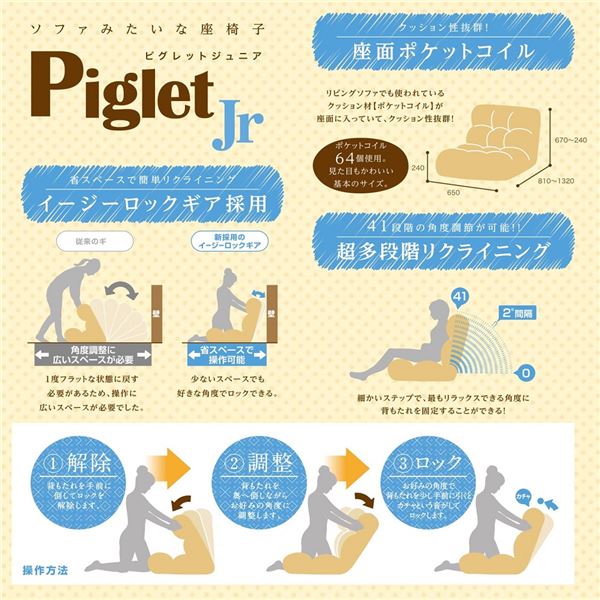 人気のピグレットJrシリーズより新色が登場。リビングソファで使用している規格のポケットコイルを採用していますのでクッション性抜群です。コンセプトは「Sofaみたいな座椅子」名前の通りソファの様にゆったりと寛ぐには最適な座椅子となっております。41段階のリクライニングが可能ですのでお好みの角度に調節可能です。イージーロックギヤ採用によって省スペースで操作可能です。豊富な張地バリエーション。