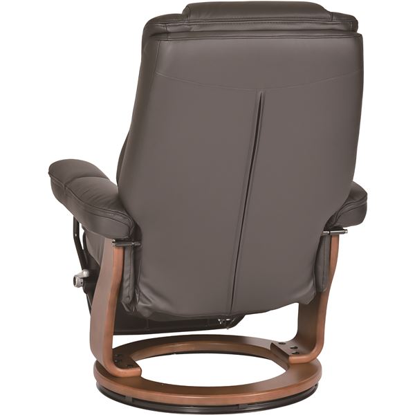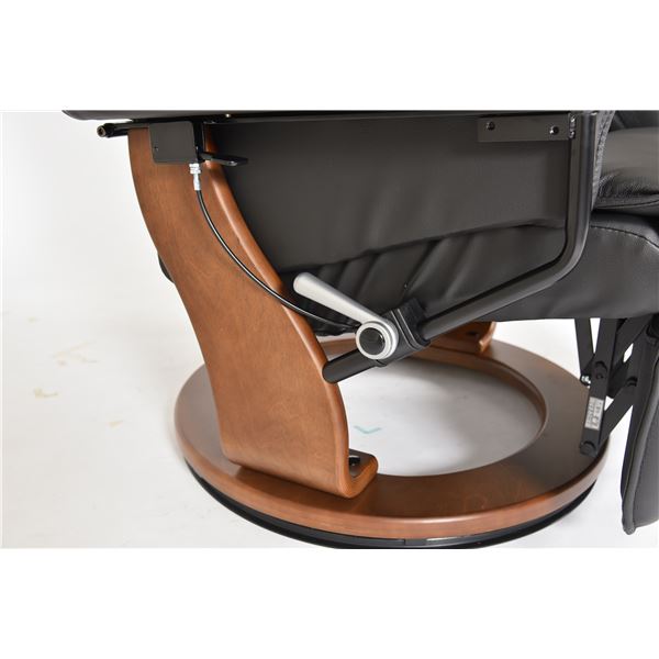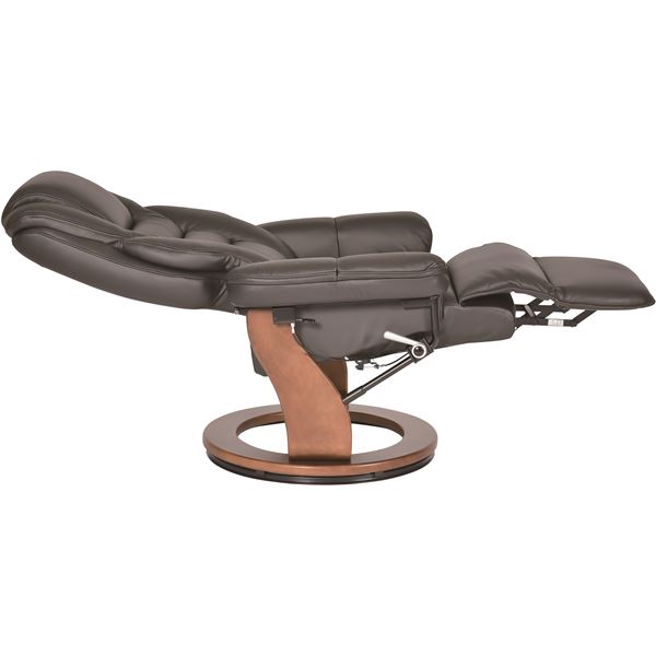 高級感のある本革仕様で本体とフット部が一体型のパーソナルチェア。背もたれは無段階でリクライニングします。フットレストはレバーで簡単に操作できます。