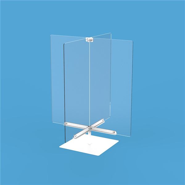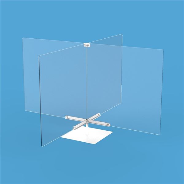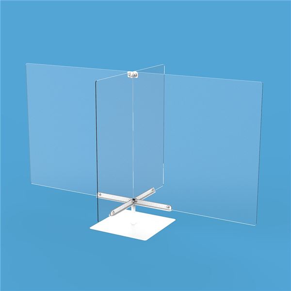 ●クロス型アクリルパーティションパネル(2枚セット)の2セットの組み合わせでテーブル上の空間を4分割する際のベース金具。