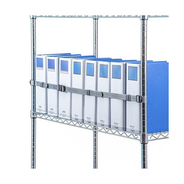 ●オープン棚に収められた書類、ケースなどの収納物の落下を防止する120cmのベルトです。