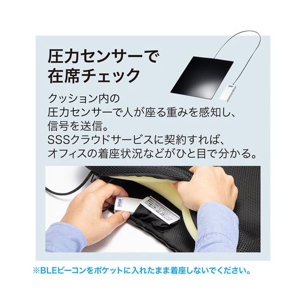 ●クッション内にセンサーを内蔵。SSSクラウドサービスにご契約頂ければオフィスの着座状況などがひと目で分かるようになります。