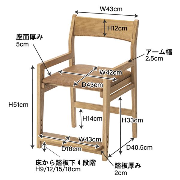 「子供から大人まで使用できるおしゃれなチェア」をコンセプトに温かみのある天然木の風合いがインテリアにマッチするチェアです。座面と足置きは成長に合わせて4段階の高さ調節ができます。