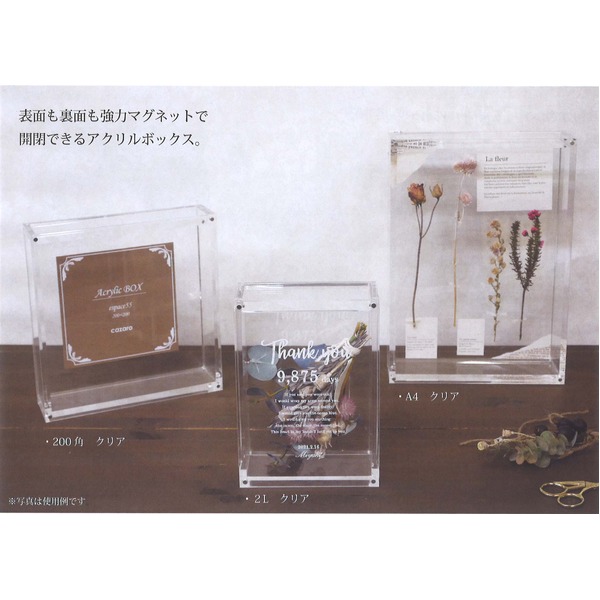 全面アクリル製の透明なBOXです。マグネットで装着できるアクリル板が3枚付いており、創意次第で様々な飾り方ができます。