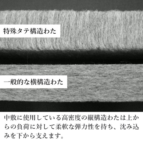 中敷に使用している高密度の縦構造わたは上からの負荷に対して柔軟な弾力性を持ち、沈み込みを下から支えるので、身体への負担が少なく、寝転んだ時でも床つき感がなく快適です。