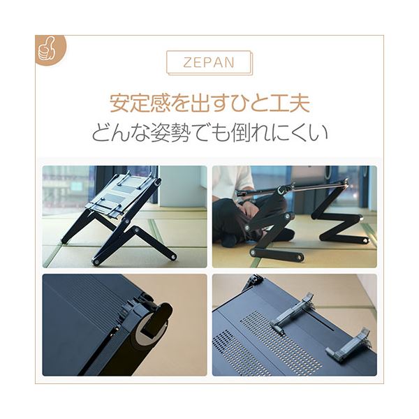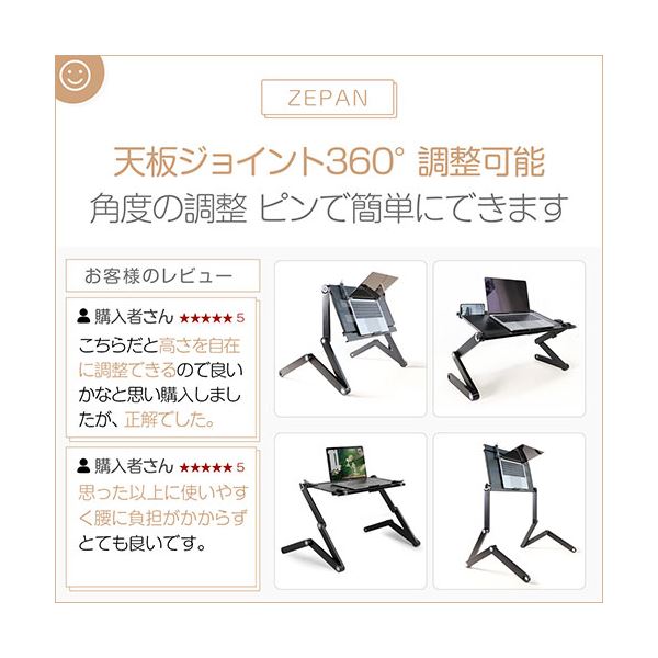 ●使用方法:本PCスダンドは、360°調整ジョイントが設置しえており、自在に変形するヒミツは、4つのジョイント!最大360°まで微調整が可能なので、思いのままにデスクの形を変えることが出来ます。天板のジョイントは、片側だけについており、ツメを倒すことで自由に調整が可能です。お好みの角度になりましたら、ツメを元の状態に戻してください。3つのアームジョイントには、角度表示があります。左右のジョイントの角度を合わせて頂くと、簡単に左右対称に設置することが可能です。なお、中央のボタンを押し込んでいる間、自由にアームの角度を調整頂けます。調整完了後は、ボタンから手を離して頂くと、再びロック状態に戻り、アームが固定されます。