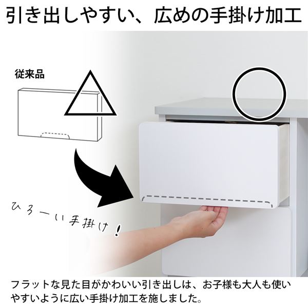 フラットな見た目の引き出しは、お子様も大人も使いやすいよう広めの手掛けにいたしました。