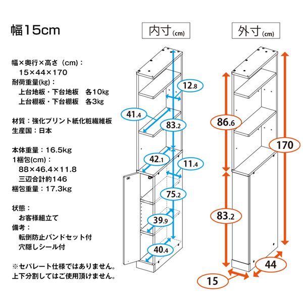 内寸:上部オープン部/幅12.8×奥行41.4×高さ83.2cm、下部扉内/幅11.4×奥行39.9×高さ75.2cm