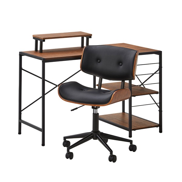 丸みを帯びた曲木と異素材の組み合わせが美しいチェアとヴィンテージ調のL字パソコンデスクのセット。