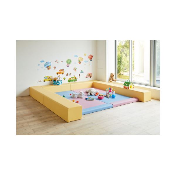 木芯材を使わないクッションだけのキッズサークル「CKシリーズ PVCレザー張り」/ベンチ幅1200mm。PVCレザーは、耐久性に優れたお手入れしやすい張地です。中身はウレタン素材なので、適度な弾力があります。マットと組み合わせてご使用いただけます。ベンチとマットは面ファスナーで連結固定できるので、設置・レイアウト変更も道具不要で簡単です。キッズサークル木製収納(706‐640)は組み合わせて使用いただけますが奥行サイズが異なりますのでご注意ください。