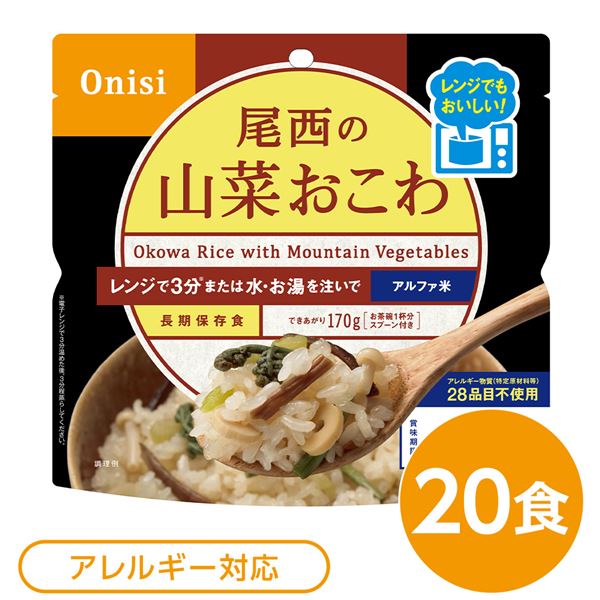 20個セット 尾西のレンジ+(プラス) 山菜おこわ 80g 20袋 電子レンジ調理可能 長期保存 非常食 企業備蓄 防災用品 代引不可