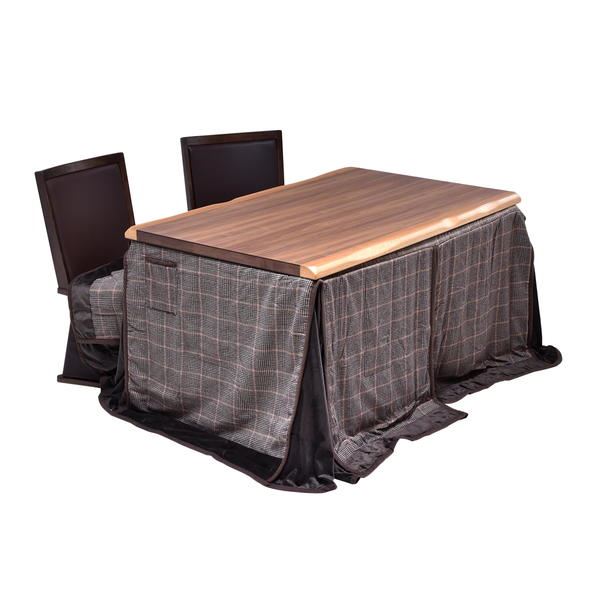 無垢の一枚板天然木風にアレンジされた、重厚感のある天板が魅力。天板の端は一枚板ならではの耳といわれる凸凹した部分もうまく表現されており、本物の一枚板のような風合いが感じられます。ヒーター部分は安心な日本メーカーのメトロ電気工業の製品が使用されており、手元で温度調節ができるコントローラー付いていて便利です。チェアーは立ったり座ったりするのに便利な回転式です。チェアーはブラウンとナチュラルの2色から選べて、掛布団は3種類の中か選べて選択肢もたくさんあるので、お好みの組み合わせが見つかります。こたつはエアコンと比較すると、約3分1の電気代で済むと言われており昨今の高騰する電気代の節約にも優れています。
