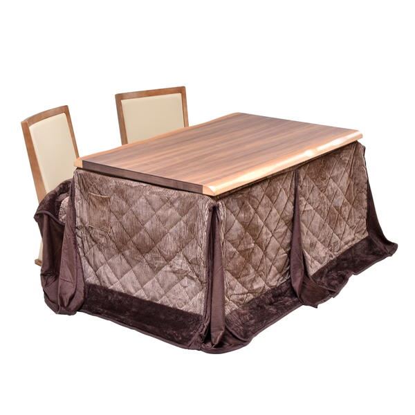 無垢の一枚板天然木風にアレンジされた、重厚感のある天板が魅力。天板の端は一枚板ならではの耳といわれる凸凹した部分もうまく表現されており、本物の一枚板のような風合いが感じられます。ヒーター部分は安心な日本メーカーのメトロ電気工業の製品が使用されており、手元で温度調節ができるコントローラー付いていて便利です。チェアーは立ったり座ったりするのに便利な回転式です。チェアーはブラウンとナチュラルの2色から選べて、掛布団は3種類の中か選べて選択肢もたくさんあるので、お好みの組み合わせが見つかります。こたつはエアコンと比較すると、約3分1の電気代で済むと言われており昨今の高騰する電気代の節約にも優れています。