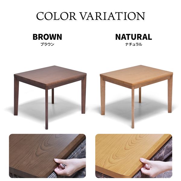 シンプルで落ち着きのある「栓(セン)」柄シートを使用し、シンプルで飽きの来ないデザインです。どこか懐かしく落ち着いた木目はお部屋にマッチしやすいです。ヒーター部分は安心な日本メーカーのメトロ電気工業の製品が使用されており、手元で温度調節ができるコントローラー付いていて便利です。ハイタイプのコタツなので、布団を外せばコタツを使わない季節でも普通のダイニングテーブルとしても使えるので、一年通して使えるコタツ兼ダイニングテーブルとして人気です。コタツの天板塗装には耐久性の高いUV塗装を施しているので、高品質なので長くお使い頂けます。コタツはブラウンとナチュラルの2色から選べて、掛布団は3種類の中か選べて選択肢もたくさんあるので、お好みの組み合わせが見つかります。こたつはエアコンと比較すると、約3分1の電気代で済むと言われており昨今の高騰する電気代の節約にも優れています。
