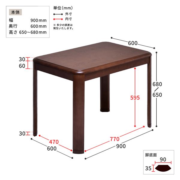 ●こたつ 商品サイズ(約):幅900×奥行600×高さ650~680mm