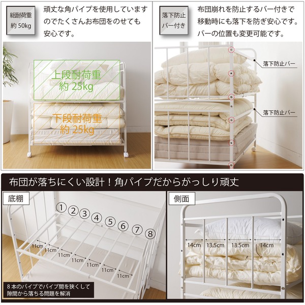 布団 収納ラック 2段 キャスター付き 高さ調整可 寝具収納 オープンラック 押し入れ収納 寝室収納 組立品 代引不可