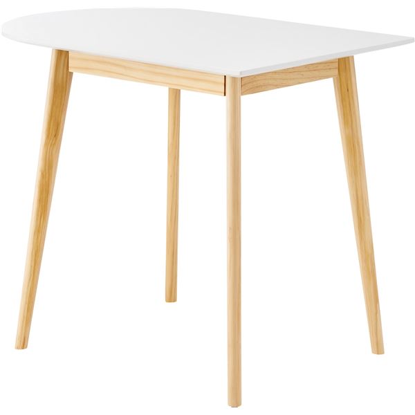 一辺に曲線を取り入れたやさしいフォルムで、凹凸のない滑らかなホワイト天板と、天然木の脚の組み合わせが可愛らしさを演出してくれます。