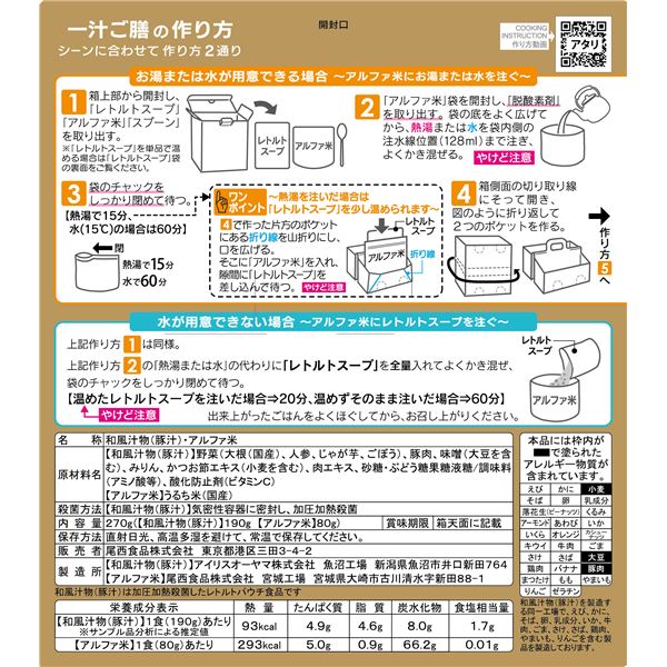 ■原材料名:【和風汁物(豚汁)】野菜(大根(国産)、人参、じゃが芋、ごぼう)、豚肉、味噌(大豆を含む)、みりん、かつお節エキス(小麦を含む)、肉エキス、砂糖・ぶどう糖果糖液糖/調味料(アミノ酸等)、酸化防止剤(ビタミンC)【アルファ米】うるち米(国産)