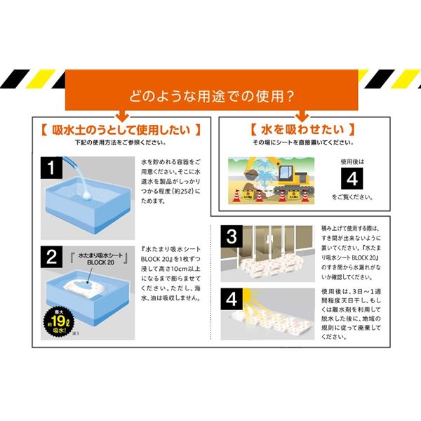 タフな現場、緊急時の備えに素早く約14?吸水!給水土のうや給水シートとしてお使いいただけます。・最大に膨らんでも、丸みを帯びた形状にならないので、積み重ねた時に隙間ができにくい!・保管場所に困らないコンパクト設計・二重構造の不織布を採用し耐久性UP(自社落下試験クリア)【使用後の処分方法】(例) 使用後3日~1週間程度天日干し、もしくは離水剤(塩化カルシウムなど)を利用して脱水し、自治体ごとに規定されている適切な方法にて廃棄します。※上記はあくまでも廃棄処分の一例です。詳しくは各自治体の法律・条例に則り適切な方法にて廃棄してください。【用途】工場・工事現場での水漏れ防止、グランドの水たまり除水